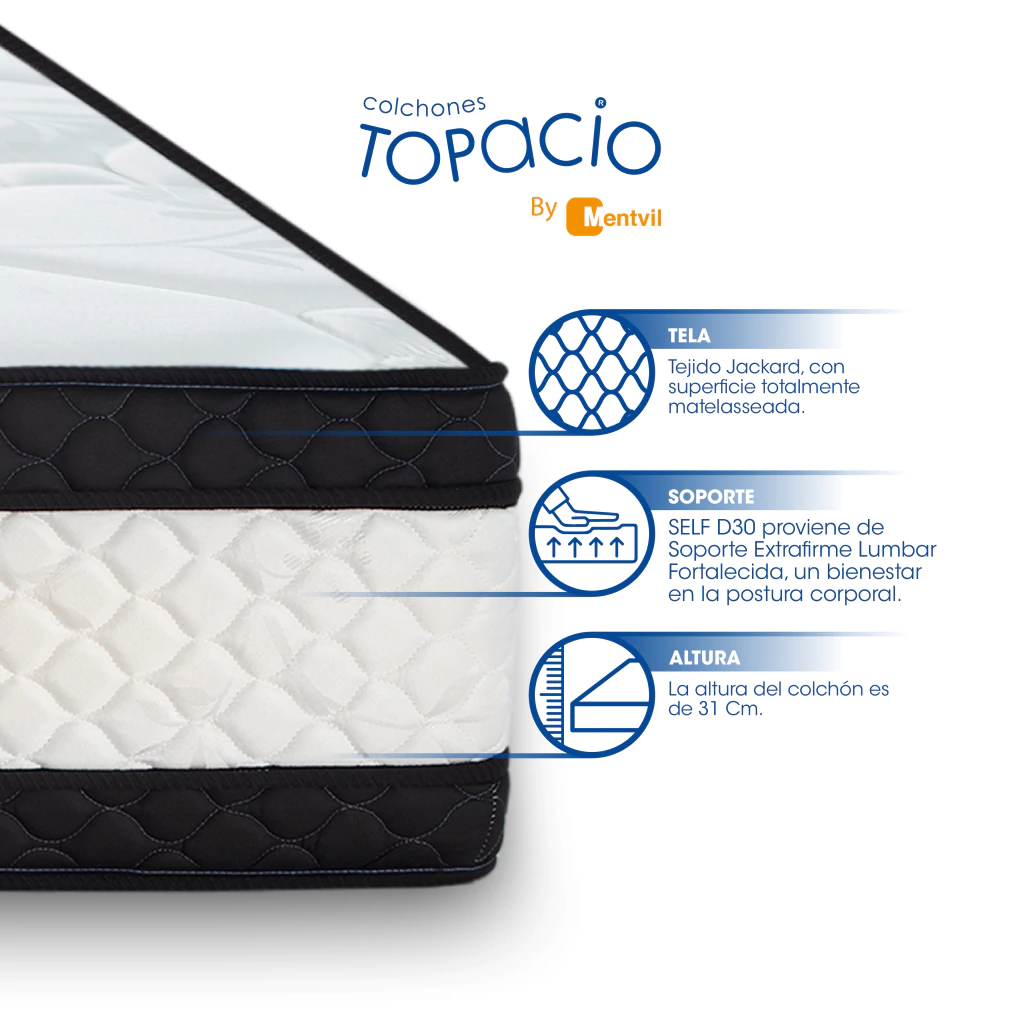 Su interior cuenta con resortes bicónicos de acero templado y doble pillow fabricado en espuma de poliuretano Topacio D30 de alta presión, que brindan una sensación de mayor suavidad sin perder firmeza. El soporte lumbar fortalecido mejora la postura y proporciona estabilidad adicional en la zona media del cuerpo.