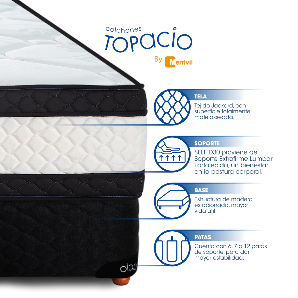 Su interior cuenta con resortes bicónicos de acero templado y doble pillow fabricado en espuma de poliuretano Topacio D30 de alta presión, que brindan una sensación de mayor suavidad sin perder firmeza. El soporte lumbar fortalecido mejora la postura y proporciona estabilidad adicional en la zona media del cuerpo.