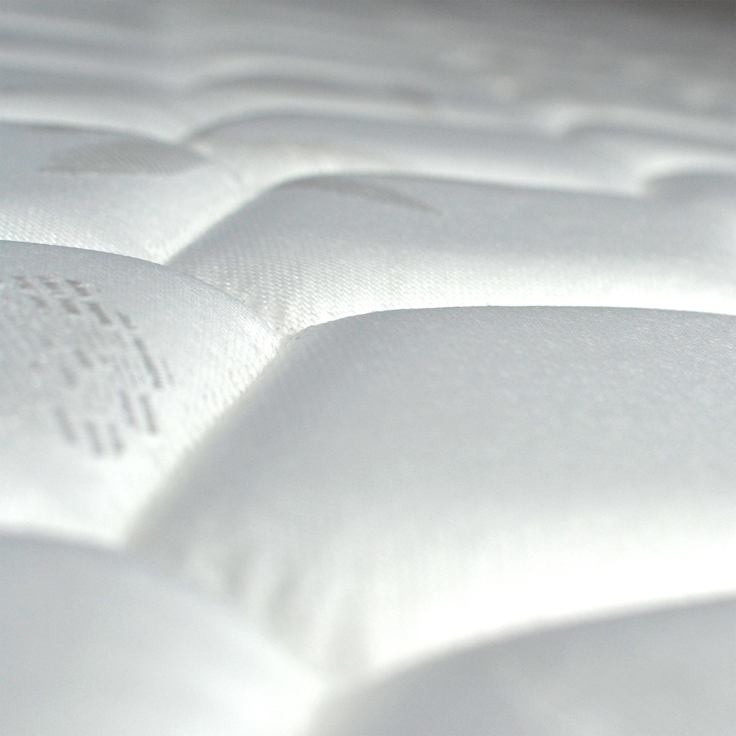 Diseño totalmente matelasseado en laterales y tapas de color blanco. Su confección está realizada con materiales de calidad, como su tela jackard que posee un tejido de mayor resistencia a la abrasión y una excelente respiración en su superficie.